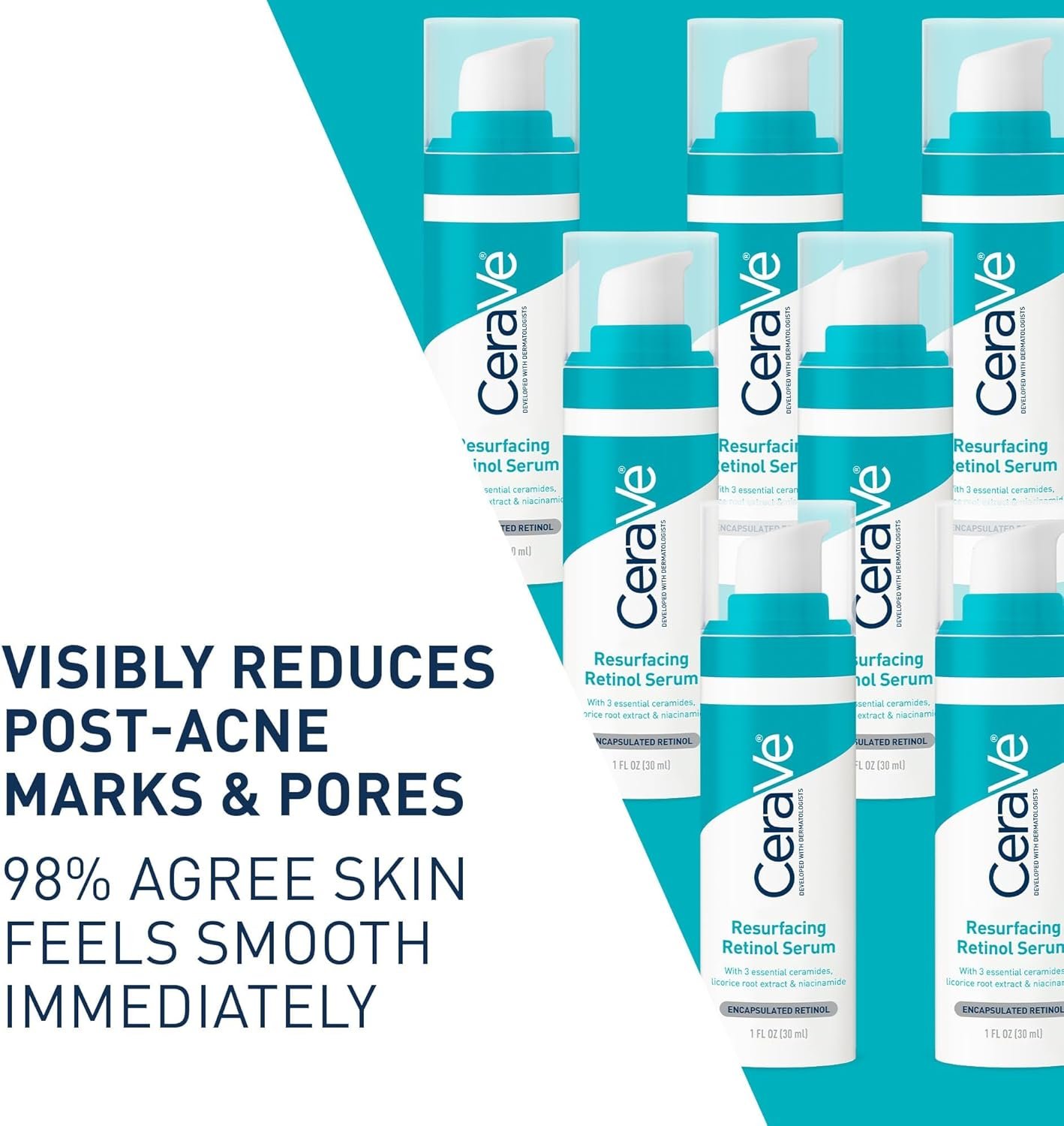Refine skin texture and target post-acne marks with CeraVe Resurfacing Retinol Serum. Developed with dermatologists, this lightweight formula combines Encapsulated Retinol with Niacinamide and essential ceramides to smooth uneven skin tone, reduce the look of pores, and support the skin’s natural barrier.