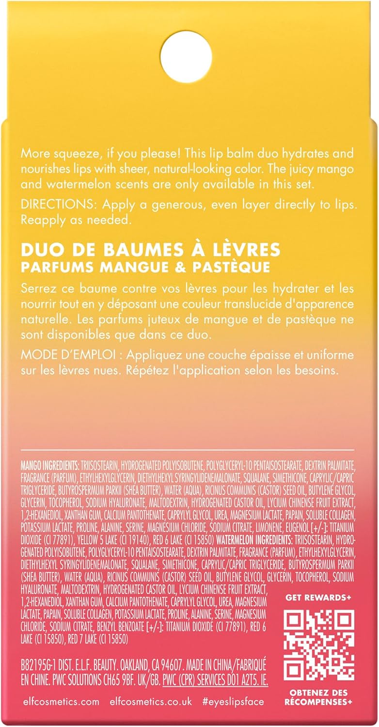 - MOISTURISING LIP BALM: Discover the ultimate lip care set for supple lips with a hint of natural colour. The e.l.f. Squeeze Me More Lip Balm Duo impresses with exclusive mango and watermelon fragrances & tones.
