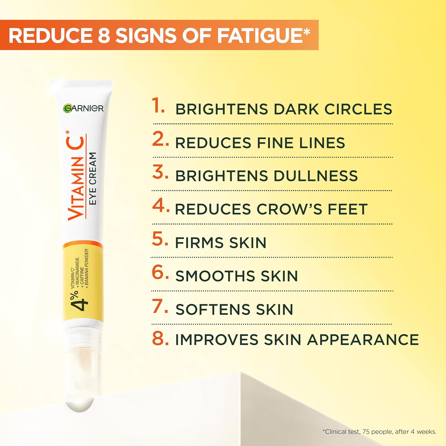 - 4% VITAMIN C, NIACINAMIDE, CAFFEINE, BANANA: Garnier’s Brightening Vitamin C Eye Cream is our first eye cream concentrated with 4% Vitamin C, Niacinamide, Caffeine & Banana Powder.